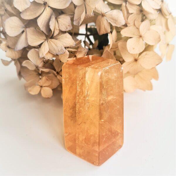 Honungskalcit ger oss möjlighet att handla i kärlek, väl medvetna om vår samhörighet med universum. Den hjälper oss vid depression och stärker vår självkänsla, uthållighet och vårt tålamod. Honungskalcit underlättar för våra utmaningar som kan innebära stora förändringar och hjälper oss att behålla balans och motivation. Den kan hjälpa oss att samla ihop våra energier på ett lugnt sätt, förena högre principer med mer jordnära känslor. Fysiskt är den bra vid spänningar i mag- och tarmområdet. Bra också mot smärtor i ländryggen.